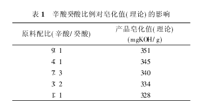 根据上表1的数据可得辛酸和癸酸的比例应该要大于3:2其反应后产品的皂化值才符合要求。木实验辛酸和癸酸选在反应。
